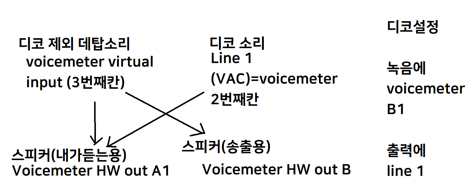 라우팅이 익숙하지 않다면 세팅 중에 잘못하는 경우 소리가 먹통이 될 수가 있으니 어떻게 구성하는지 정확히 아는 것이 중요하다. 사실 필자도 대충 막 눌러보면서 하다가 계속 소리 안나는 문제가 생겼고, 지인들 도움으로 겨우 해결했다. 핵심은 디코에서 사람들 말하는 소리와 내 컴퓨터에서 원래 나오는 소리를 분리해내는 것이 매우 중요하다는 것이다. 다음 그림을 참고한다.