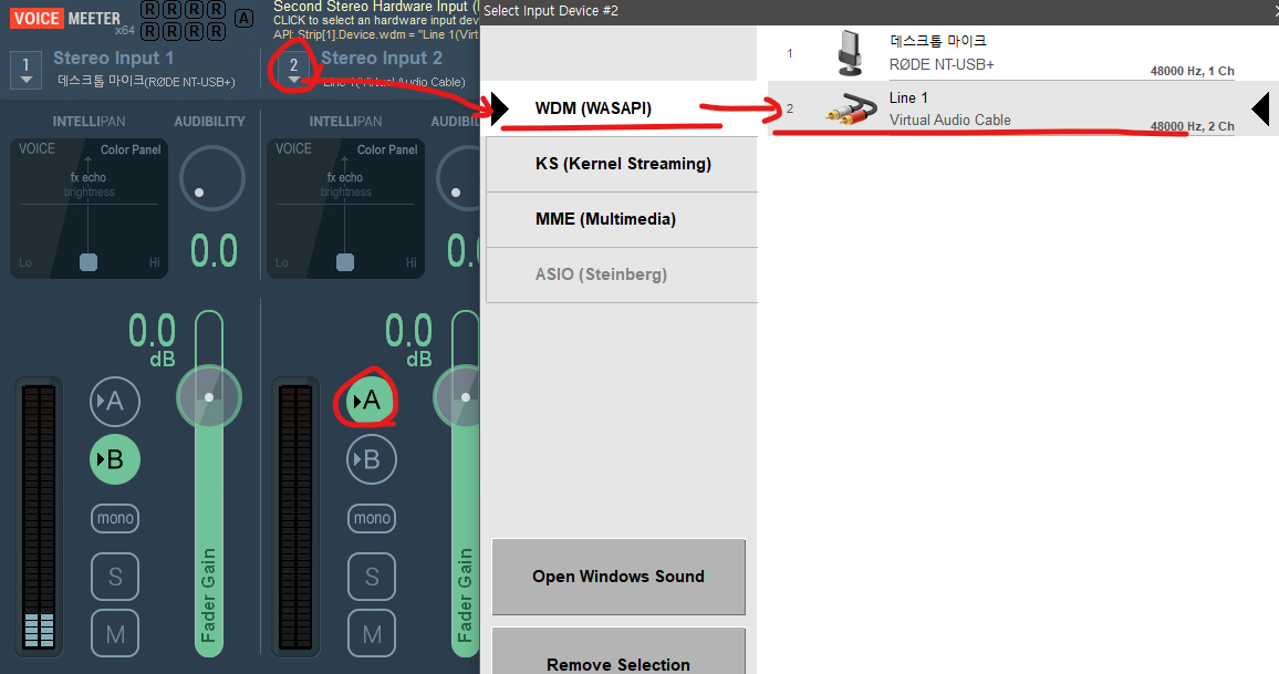 이제 위에서 설정한 디코 사람들 목소리 line 1으로 보낸 것을 나만 들을 수 있게 설정한다. 보이스미터의 2번째 스테레오 인풋에서 숫자를 누른 후 이번에는 Line 1을 설정한다. VAC 설치 안했으면 어쨌거나 그 새로 추가된 가상 채널로 설정해 준다. 그리고 스테레오 인풋2의 출력을 A만 켜고 B는 끈다. 이렇게 하면 사람들 목소리가 재송출되지 않고 나만 듣는 소리인 A로만 출력된다.