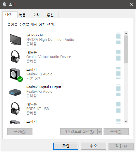 뜬 창에서 재생 탭을 누르면 자기가 원래 소리를 듣고 있던 장치가 나올 것이다. 필자의 경우 아래 스샷과 같이 Realtek(R) Audio가 기본 장치로 표시되며, 개인별로 다를 수 있다. 혹시나 voicemeeter 설치하면서 바뀐 경우 이것저것 바꿔보면서 평소에 듣던 소리의 세팅으로 나오는 장치를 찾아준다. 나중에 설정할 때 쓰이니 이것의 이름을 잘 기억한다.