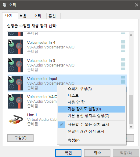최종적으로는 보이스미터에서 모든 것을 컨트롤하게 할 것이므로 설정을 보이스미터로 바꿔 줘야 한다. 아까 띄워 뒀던 윈도우 소리 설정의 재생 탭에서 Voicemeeter input이라고 된 것을 찾아서 기본 장치로 설정 및 기본 통신 장치로 설정을 해 준다. 이름이 비슷한 게 많으므로 정확하게 저렇게 써있는 것을 잘 선택해서 설정해 준다.