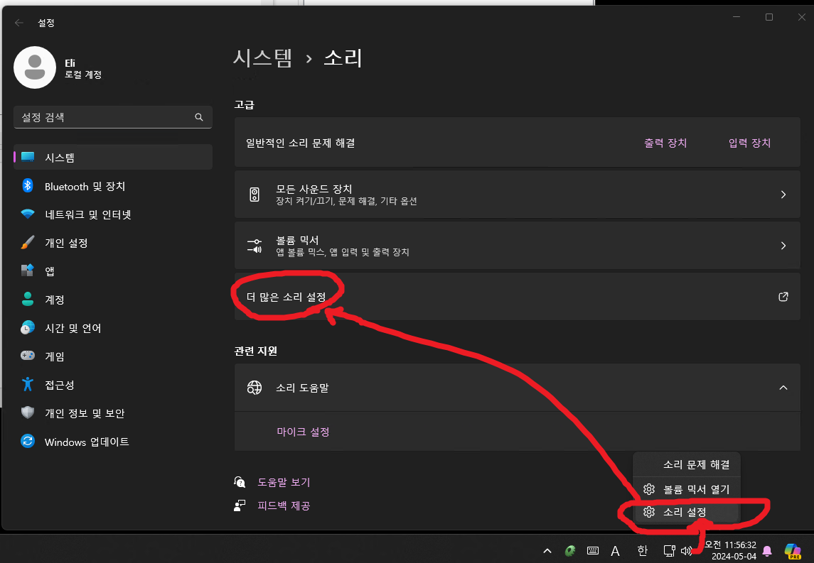 윈도우 11인 경우 약간 복잡한데, 소리모양 아이콘 우클릭 후 소리-설정 해서 나오는 창에서 스크롤 내리다보면 나오는 더 많은 소리 설정 을 누른다.