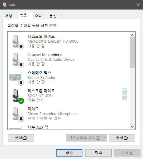 녹음 탭을 눌러 보면 본인의 마이크가 기본 장치로 선택되어 있을 것이다. 필자의 경우 외장 마이크인 RODE NT USB plus 사용 중이라 아래와 같이 표시된다. 역시 나중에 세팅할 때 필요하니 잘 기억해 놓는다.