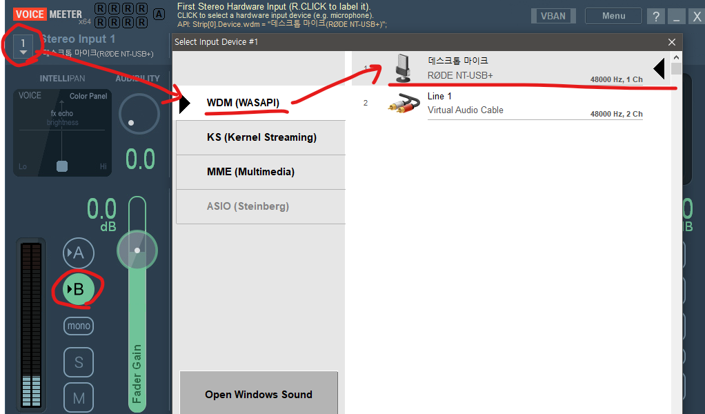 이제 마이크 쪽 세팅을 해 준다. 보이스미터의 스테레오 인풋 숫자를 눌러서 사용하던 마이크 골라 준다. 마이크 소리는 디코 송출을 할 것이기 때문에 B만 켜고 A는 꺼 준다.