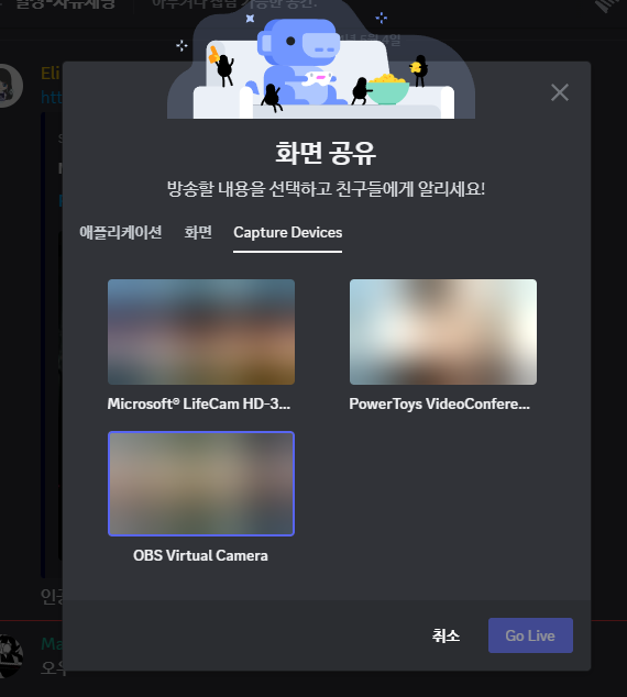 디코 방송을 켜고 화면 공유를 누르면 Capture device라는 tab에 아래와 같이 OBS virtual camera가 생겨있다. 이걸로 잡으면 된다. 기본적으로 OBS virtual camera는 소리가 없다는 점에 주의한다.