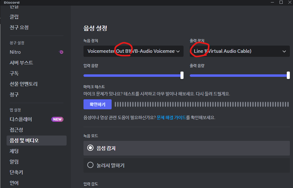 스크롤 내려서 왼쪽에 음성 및 비디오를 누르면 다음과 같이 설정 창이 나온다. 녹음 장치에는 보이스미터 out B1으로 세팅해 준다. 이렇게 하면 보이스미터의 B에 들어가는 소리가 디코로 송출된다. 출력 장치는 디코에서 나오는 소리, 즉 사람들 목소리인데 이것을 보이스미터로 바로 넣어주는 것이 아니라 VAC 설치해서 생긴 line 1으로 넣어 준다. 이 소리를 뒤에서 나만 듣고 재송출되지 않게 설정할 예정이다.