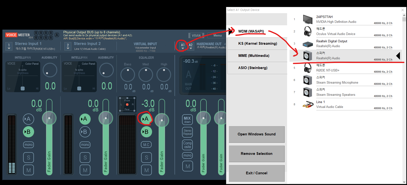 아래와 같이 뭐가 복잡한 창이 뜰 텐데 맨 오른쪽의 Hardware out의 A1을 눌러서 WASAPI - 아까 봐뒀던 재생장치를 눌러 준다. 이후 아무 소리나 틀어 보면 3번째 칸에 Virtual input이라고 된 데에 소리가 잡히고, 오른쪽에 A B라고 된 것들에도 소리가 잡히면서 소리가 들릴 것이다. 이 때 3번째 칸의 Virtual input에서 A가 켜져 있어야 한다.
