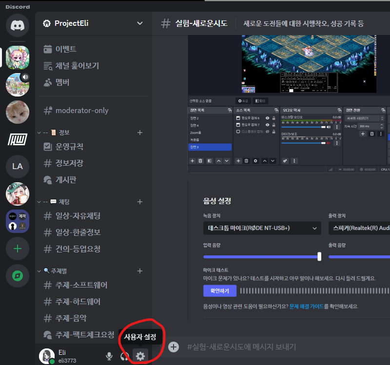 다음으로 디코 사람들 소리를 내가 들을 수 있게 세팅해 준다. 디코 창에서 아래와 같이 톱니바퀴 모양 사용자 설정을 찾아서 눌러 준다.