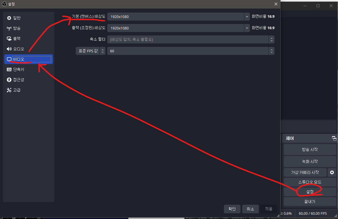 OBS에서 출력되는 영상의 해상도를 설정한다. OBS 오른쪽 아래의 설정-비디오-기본 캔버스 해상도를 수정한다. 캔버스 해상도는 OBS상에서 보이는 해상도이며 각종 창 추가할 때 100%크기로 들어가니 본인 화면 해상도랑 똑같이 맞추는 것을 추천한다. 출력 해상도는 송출할 해상도인데 기본적으로는 본인 화면 해상도랑 똑같이 맞추면 된다. 디스코드의 경우 서버 부스트를 안하면 720p 30fps로 나가는데 필자는 그냥 1080p로 해도 문제 없었다. 바꾸고싶으면 바꿔도 된다.