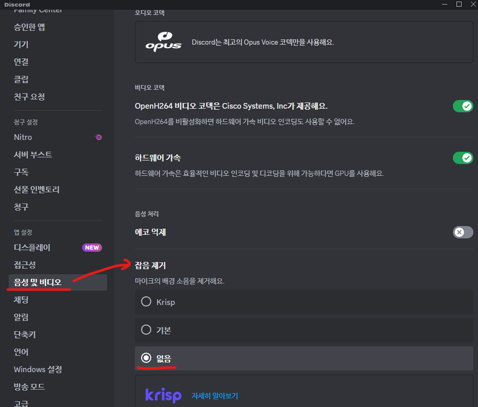위와 같이 세팅을 하는 경우 게임소리 및 음악소리가 마이크 소리 들어가는 채널로 함께 들어가는 것이기 때문에 마이크 잡음제거의 영향을 받는다. 당연히 말소리 아닌건 디코가 지우려고 시도하므로 잡음제거 꺼줘야 한다. 디코 설정에 음성 및 비디오-잡음 제거 항목에 있다. 아래 스샷 참고한다.