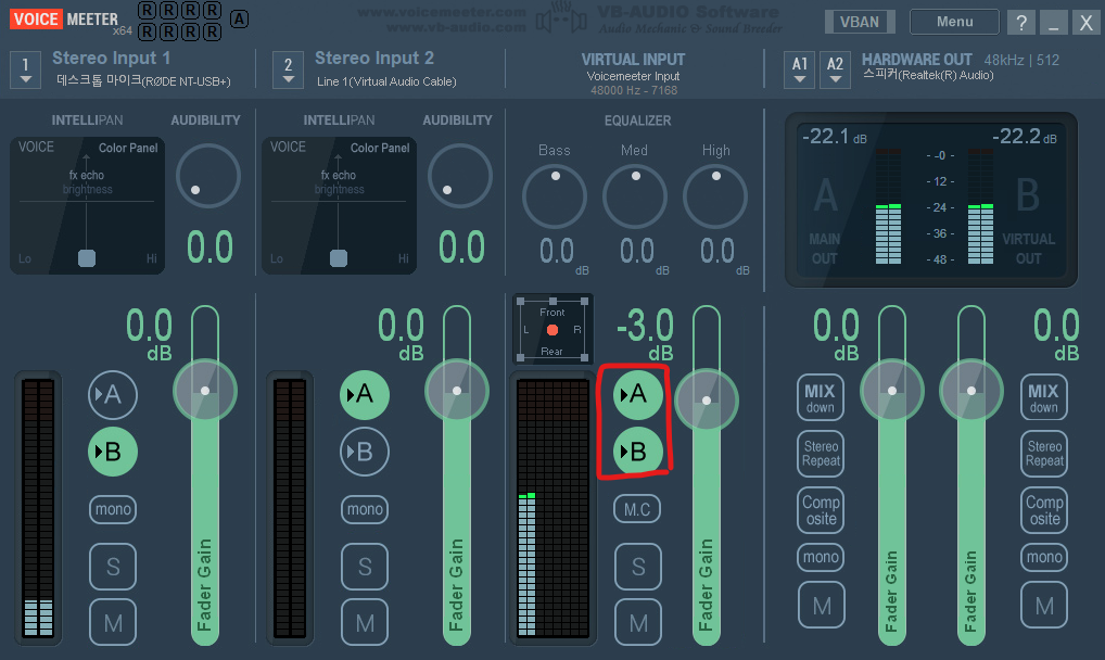 마지막으로 컴퓨터에서 나는 소리가 내가 듣는 출력 및 디코 송출 양쪽으로 모두 나가는지 확인한다. virtual input에서 A랑 B가 다 켜있는지 보면 된다. 여기까지 하면 소리는 완성이다.