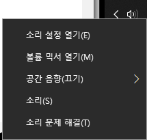 윈도우 10인 경우 작업 표시줄에 소리모양 아이콘을 우클릭-소리 를 누르면 윈도우 소리 설정 창이 뜬다.