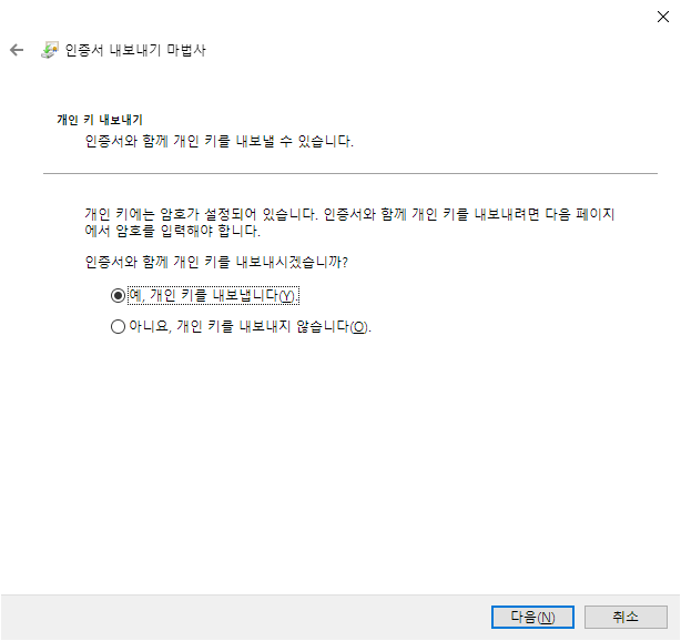 아래와 같이 인증서 내보내기 마법사 뜨는데 다음 클릭