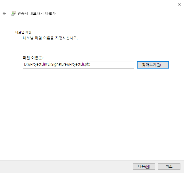 개인 키 내보내기 클릭. 이렇게 해야 pfx 파일로 생성된다. 2024-06 기준 pfx로 만들어야 제대로 서명이 된다.