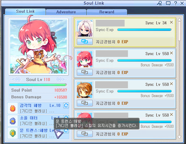 2024-10-31 기준 업데이트: 소울렙 110, 소울스킬 3번째 칸 문트랜스 해방(가디언블레싱 1분 30초로 증가), 싱크레벨 550 3개 완성으로 보너스데미지 16500