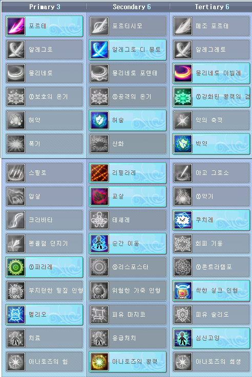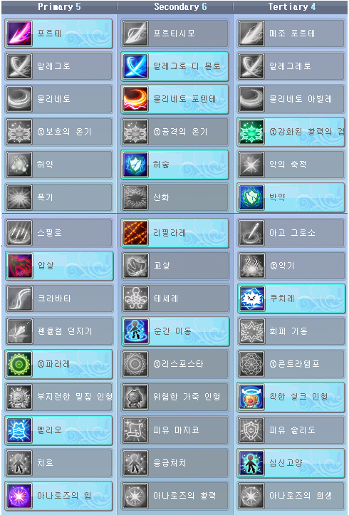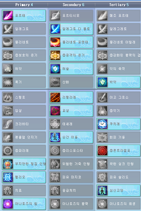 리체는 모드도 3종류나 되고 각 모드별로 스킬구성도 달라서 마스터리가 복잡함. 상황에 맞게 모드 변환해서 쓰면 유용하게 쓸 수 있지만 생각보다 많은 사람들이 기본 모드(악의 무구) 만 사용하는 듯함. 필자는 크게 압살과 교살 프리셋으로 나눠서 필요에 따라 스위칭해서 쓰고 있음. 스위칭 방법은 퀵슬롯에 공통계의 마스터리 스킬을 드래그해서 등록 후 마우스 우클릭으로 사용 중.