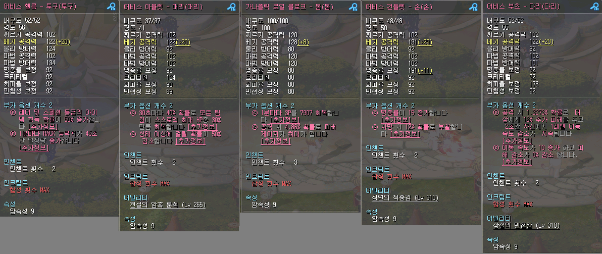 이제 세트옵이 없어져서 한부위씩 올림. 매물 없어서 직작함. 어비스라 인크 안해도 돼서 직작했음. 부츠는 부가스크롤 쌀 때 3개인가 돌렸는데 10/5, 15/2, 10/0 떠서 운없다 생각하고 10/0에서 멈춤. 향후 부가스크롤 싸게나오면 다시 돌릴 의향 있음.