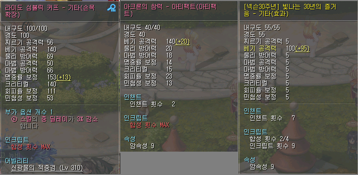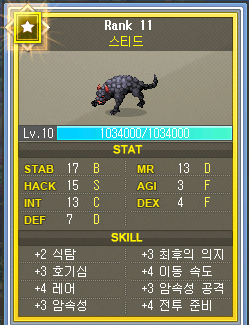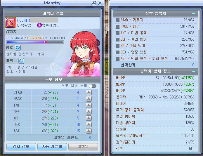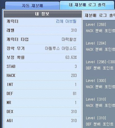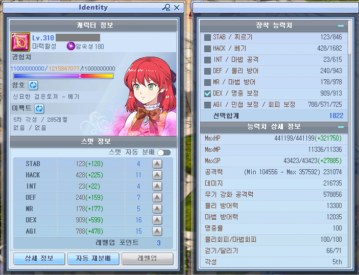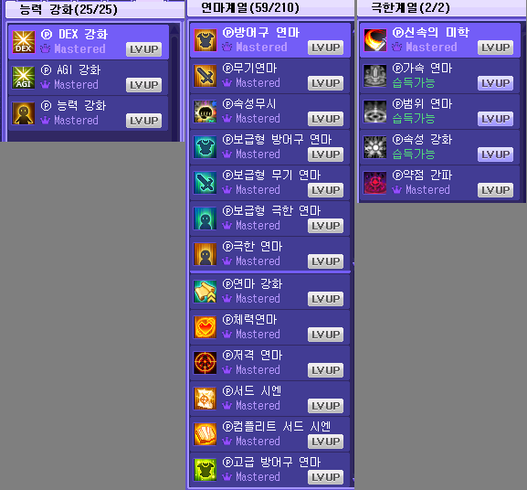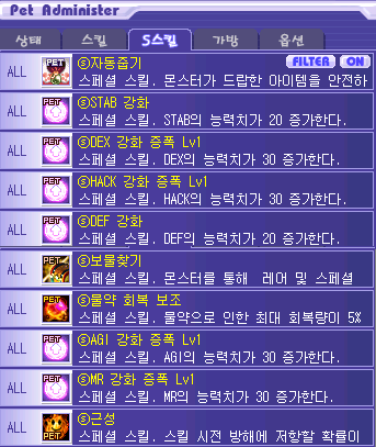 펫 S스킬은 이벤트 보상으로 준 넥슨캐시로 자동줍기와 근성 구매했고, 보물찾기는 엘티보 눈사람 구매, 물약회복 보조는 거래소 구매함. 나머지 스탯 강화류들은 거래소에서 hack과 dex위주로 구매했고 agi def mr은 비싸서 강화 증폭 1렙까지만 함. 풀어비스 맞추면 2렙까지 올릴 예정.