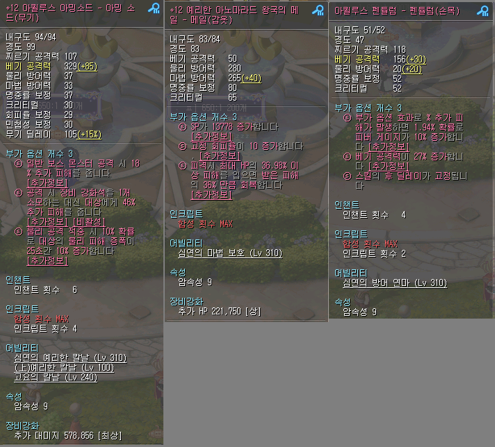 무기는 데모닉 - 떡아퀼아밍 - 한계아퀼아밍 순으로 올렸고 거래소 구매함. 갑옷은 이벤트 참여보상 왕국갑을 12만들어서 부가옵만 SP로 붙임. 향후 더 높은 갑옷 나올거같아서 인챈은 안함. 손목은 가성비 아퀼 한계 펜듈로 거래소 구매함.