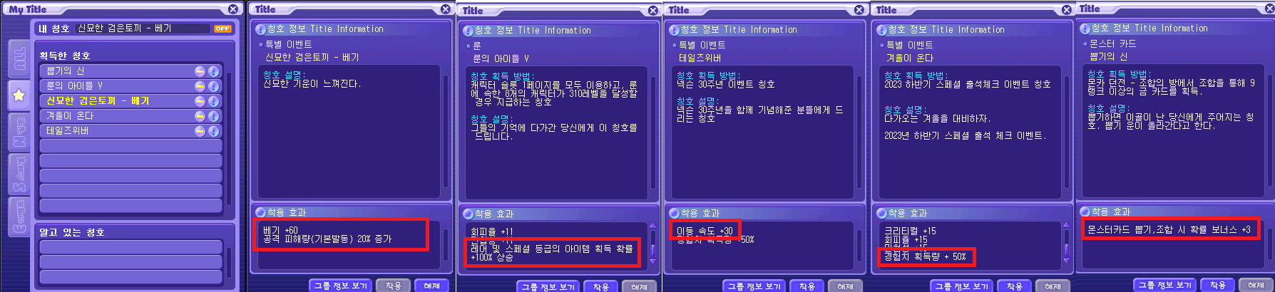 칭호는 기본값이 데미지 20% 칭호를 쓰고 있고, 2024년 기준 최신은 영검한 청룡(베기70, 뎀증20%) 이지만 베기 10차이밖에 없어서 작년에 나왔던 신묘 베기(베기 60, 뎀증 20%)를 사용 중.