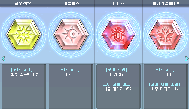 처음에는 머큐코어 60, 어비스코어 60 주스탯으로 올림. 이후 어어갈때쯤 어비스코어 120으로 올림. 5각하고 어비스코어 210했고 고방마 이후에 어비스 코어 마스터 함. 이클코어 시오칸코어는 건들지 않았음. 다시 한다면 머큐코어는 부스탯으로 올렸을 것 같음.