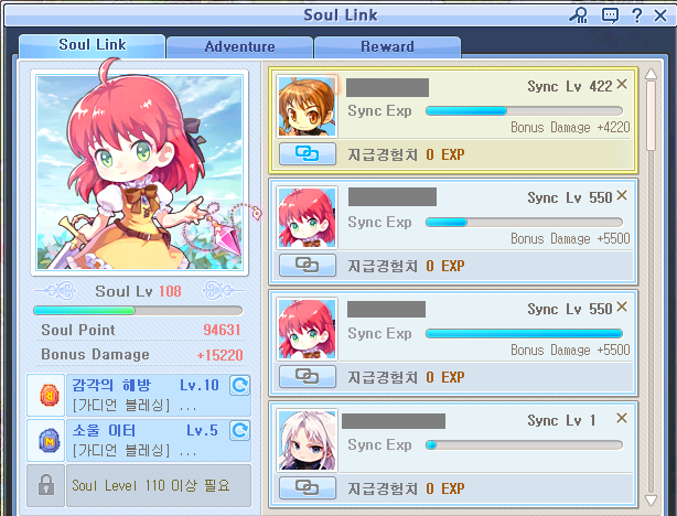 부캐 싱크레벨은 잠수 열심히 해서 550렙 2개 찍었고 마지막 550렙을 위해 마을에서 싱크켜고 잠수중. 소울렙 렙업에 방해 안되게 이벤트로 주는 경험치 100억짜리 템 부캐에 먹여서 경험치바 110억 끝까지 만들고 링크 걸어놓는중.