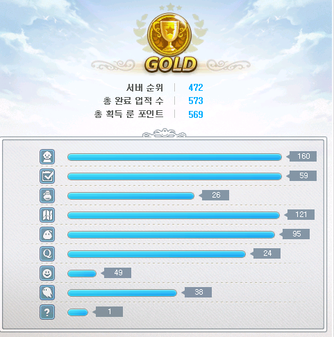 실반방 시절에 룬 마스터 찍었고 현재 총 포인트 569. 초반에는 보스류 업적이랑 맵업적 깼고, 룬 포인트 부족한 건 NPC 호감도 업적으로 채웠음. 이후 전캐릭 310렙 달성으로 약간 남는 걸로 최반 찍는 데 씀.