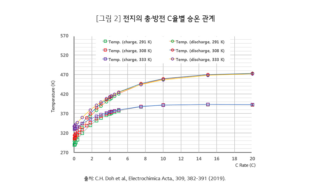 다음의 그래프는 충전 및 방전 시 발열에 대해 계산한 한국전기연구원의 연구 내용이다. 가로축이 C rate라고 되어있는데 charging rate의 약자이며 배터리의 전압은 대체로 고정이니 높아질수록 전류량을 늘려서 빨리 충전하는 거라고 보면 된다. 세로축은 절대온도 켈빈인데 섭씨로 바꾸려면 대략 273을 빼면 되며, 같은 전류량이라도 충전할 때보다 방전할 때 열이 훨씬 많이 나는 것을 알 수 있다. 그리고 당연하지만 전류량이 커지면 열이 더 많이 오르고, 일정이상 갔을때 더 안올라가는 이유는 주변온도가 낮아서 식는 영향을 고려했기 때문이다.