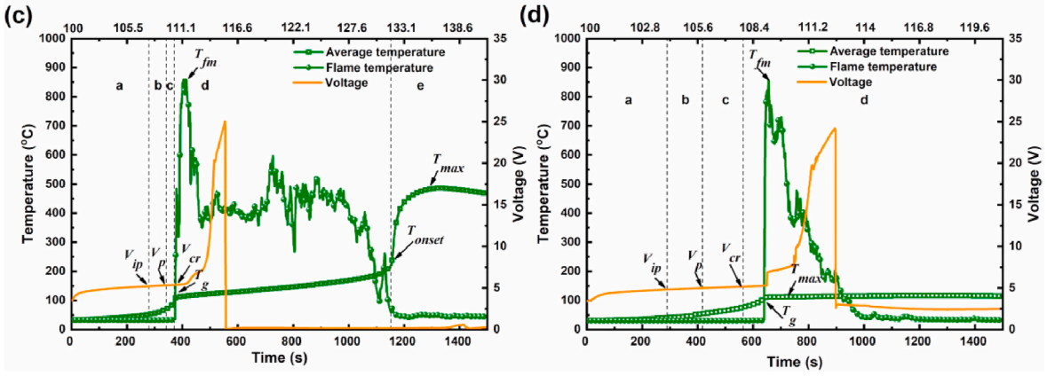 다음은 가로축이 충전 퍼센트가 아니라 시간에 따른 변화를 본 그래프이며, 자료 [19]의 결과이다. 왼쪽은 충전속도가 1C인 경우, 오른쪽은 충전속도가 0.5C인 경우이다. 충전 퍼센트 100 넘어가는 구간에 대해서만 그려져 있다. 이 연구의 경우 앞의 [20]의 그래프와는 전압이나 온도 상승 양상이 다르긴 한데, 어쨌든 약 100도가 넘어가면 불이 붙고 열폭주가 시작되며, 2차 열폭주도 있는 모습을 확인할 수 있다. 0.5C 충전의 경우 2차 열폭주 없이 한 번에 불타고 끝났으며, 불은 났지만 배터리 온도는 100~200도 사이로 유지되었다. 모든 그림을 가져오진 않았지만 1C 이상의 빠른 속도로 충전하면 2번에 걸쳐서 타고 배터리 온도가 같이 수백 도까지 증가하는 것을 확인할 수 있었다.