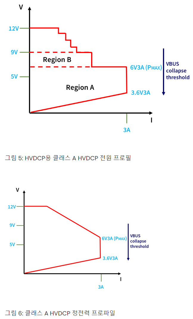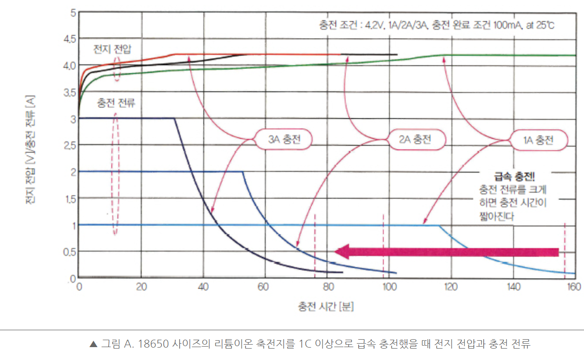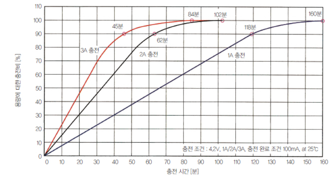 어쨌거나 전압은 배터리에 달려 있는 자체 보호회로 등에 의해 앞에서 알아봤던 4.2V 등으로 제한된다고 가정하고 전류를 보면 5V에서 최대 3A 수준으로 꽤 큰 것을 알 수 있다. 만약 일반 USB 포트에 꽂으면 5V에 0.5A도 안 나올 것이다. 이렇게 같은 전압에도 전류를 높이는 것을 급속 충전으로 본다면 자료에 나와 있는 그래프를 이해할 수 있다.