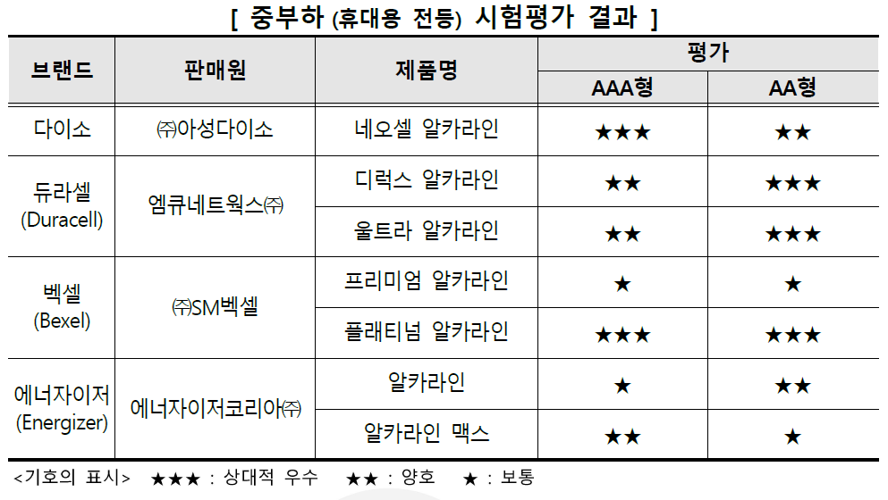 [6] 다이소, 듀라셀, 벡셀, 에너자이저 건전지 4개 브랜드 품질비교 시험평가 (한국소비자원 2024.06, 세부내용 첨부 pdf참고): https://www.consumer.go.kr/user/ftc/consumer/cnsmrBBS/79/selectInfoRptDetail.do?infoId=A1080397