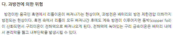 과방전시 전극의 구리막이 산화되어 분리막을 손상시킬 수 있음