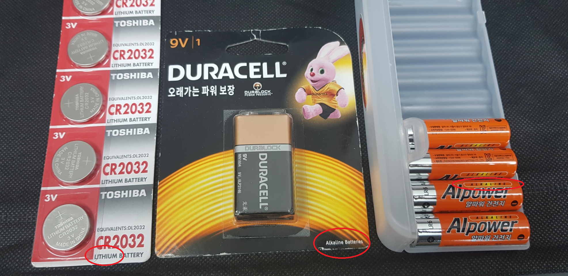 건전지는 알카라인, 리튬 1차전지 등 다양하고 충전되는 리튬이온은 잘 없음
