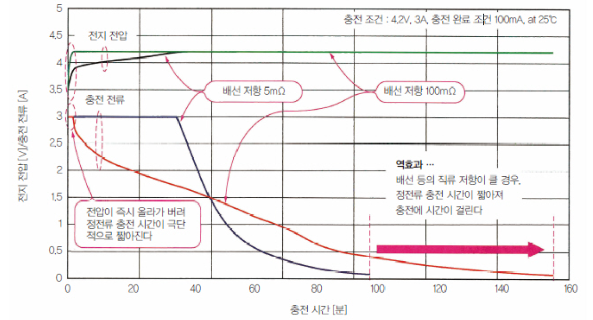전압 감지 회로는 충전기 안에 있을 것이므로 충전 선에 걸리는 전압을 더해서 전압 감지 회로가 잡아버려서 전류가 크면 클수록 안 그래도 2단계로 빨리 넘어가는데 이 효과로 더 빨리 넘어가게 된다. 이것을 나타낸 것이 자료에 있는 다음 그래프이다. 같은 전류라도 충전선 저항이 크면 충전이 오래 걸리는 효과가 생각보다 클 수 있다는 것을 시사한다.