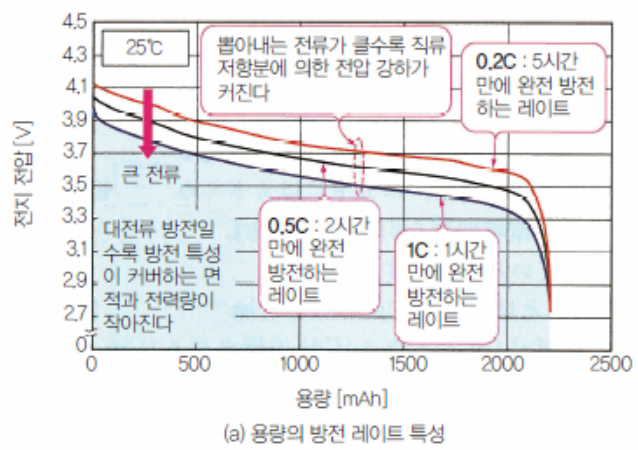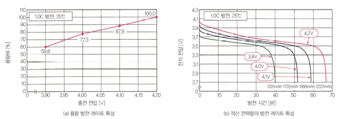 C rate가 1이면 1시간, 2면 30분 만에 충전되는 것. 셀 1개 기준 리튬 이온 전지의 방전 전압은 3.6V, 완충은 4.2V 정도, 완전방전은 3.0V 정도