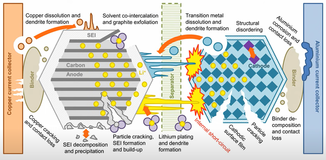몇 년 전에도 삼성 스마트폰(갤럭시8이었던 것으로 기억)이 터지는 사고로 떠들썩했었고, 이번과 유사하게 특정 업체 배터리를 사용한 전기차에서 화재가 계속 나서 문제가 됐었던 적도 있었다. 당시에 찾아본 바로는 그냥 뭐 정품 충전기 쓰고 오래되면 교체하고 과충전 하지말고 뭐 그런 류의 원론적인 이야기들만 많이 봤었고, 왜 그러면 안되는지에 대한 설명은 거의 찾아볼 수 없었다. 2024년 시점에서 검색을 해보니 다음과 같은 그림이 나온다.
