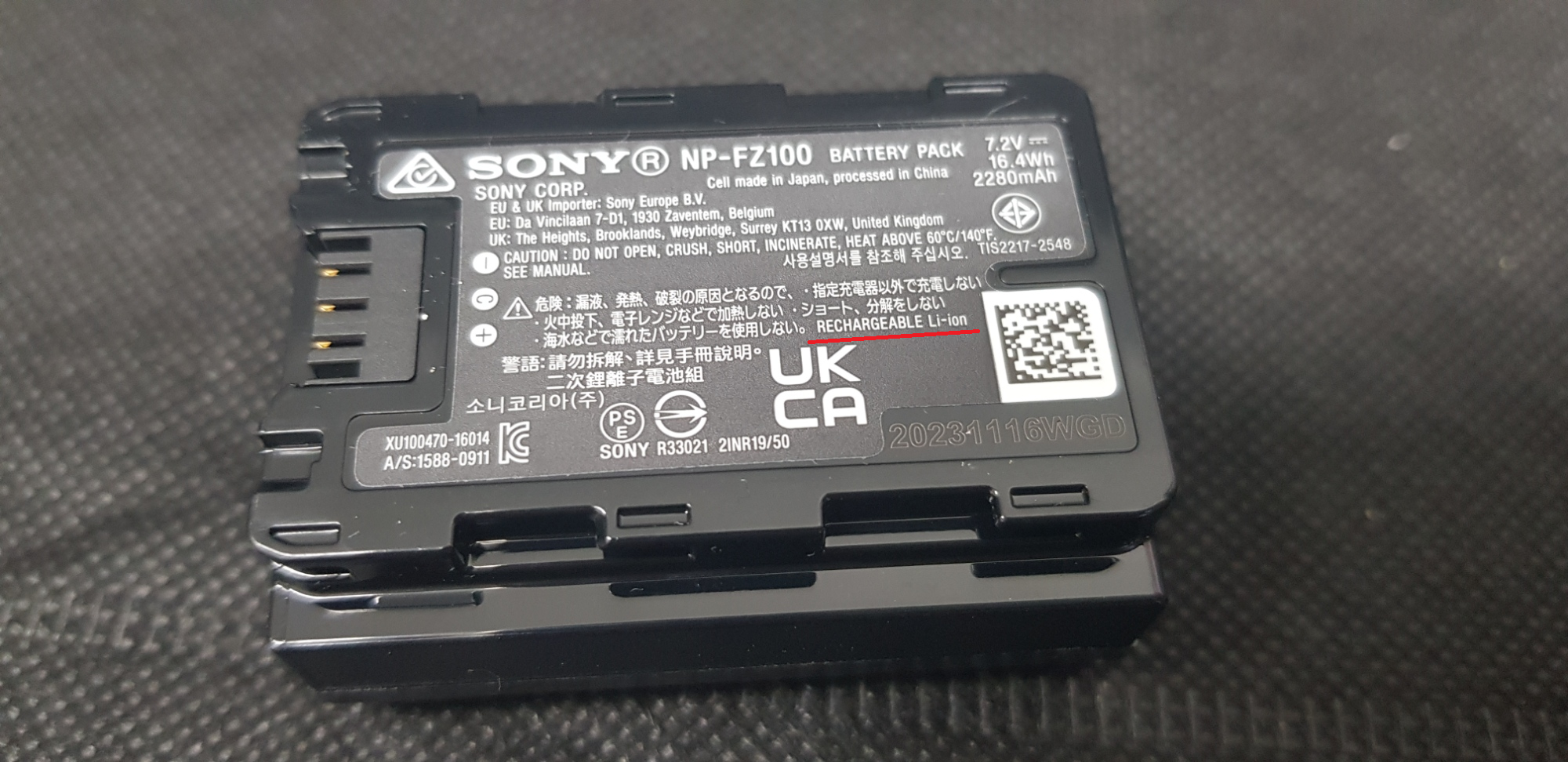 보유 중인 소니 미러리스 카메라 배터리를 꺼내 보니 Rechargable Li-ion 이라고 써 있다. 참고로 1차전지는 충전이 불가능하고, 2차 전지는 재충전이 가능하다는 차이가 있다. 즉 충전 가능한 전지들은 다 2차 전지라고 보면 된다.