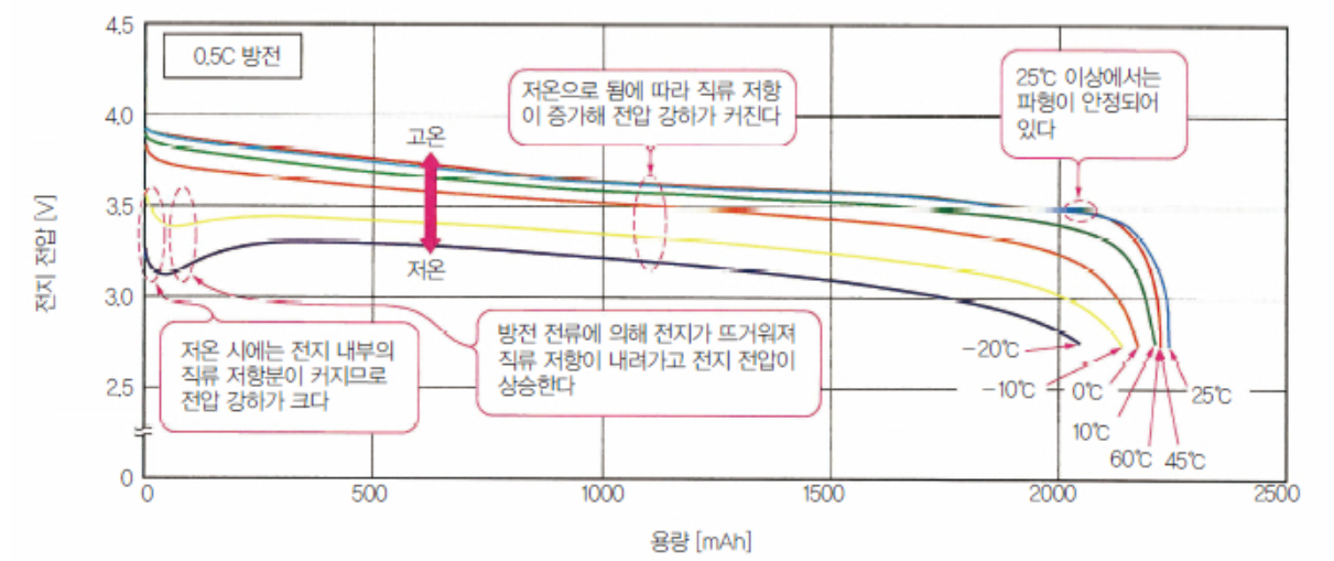 주변온도 낮으면 전압이 많이 내려가고, 이 때문에 같은 방전 속도에서 용량이 줄어듦