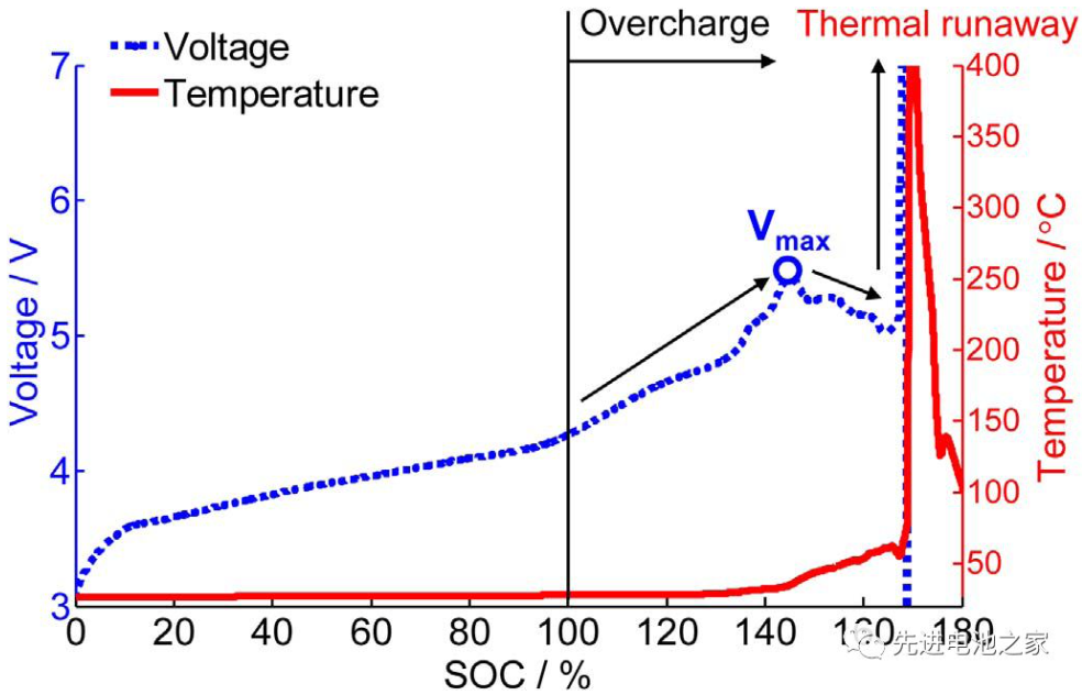 다음은 열폭주시 전압과 온도의 관계이다. 가로축은 state of charge로 충전 퍼센트라고 보면 된다. 충전이 100%를 넘어가면 당분간은 발열 없이 전압이 점점 오르다가 5V도 넘어가고 일정 임계선에 도달하면 오히려 전압이 내려가면서 열이 급격히 오르고, 더 충전하다가 한계에 다다르면 열폭주를 일으킨다.