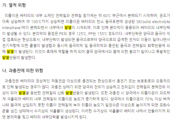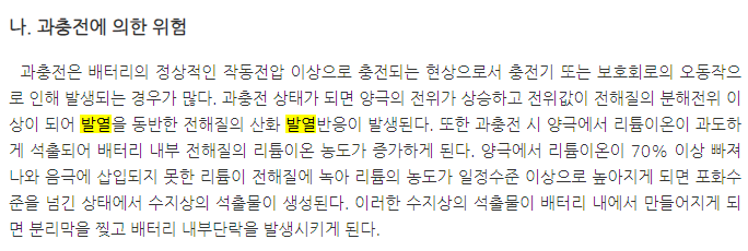 앞의 한국화재보험협회 자료를 다시 보면 다음과 같이 전압에 대한 언급이 있다. 어려운 말 집어치우고 이해를 해보자면 전압이 높아지면 원래는 이동통로 기능만 해야 하는 전해질이 고전압에 의해 분해되면서 열이 난다는 얘기다.