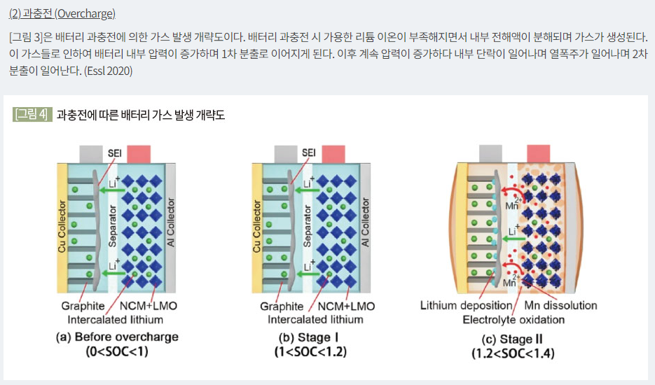 과충전하는 경우 앞의 자료 [14]에도 언급이 있다. 물론 2017년에 비해 기술이 발전해서 아래 수치보다 열분해 온도는 올라갈 수도 있지만 어쨌거나 60도 정도만 올라가도 전해질이 분해될 수 있다는 점을 알 수 있다. 이외에도 과방전, 물리적 손상, 제조 중 이물질 오염 등 다양한 이유도 다루고 있다.