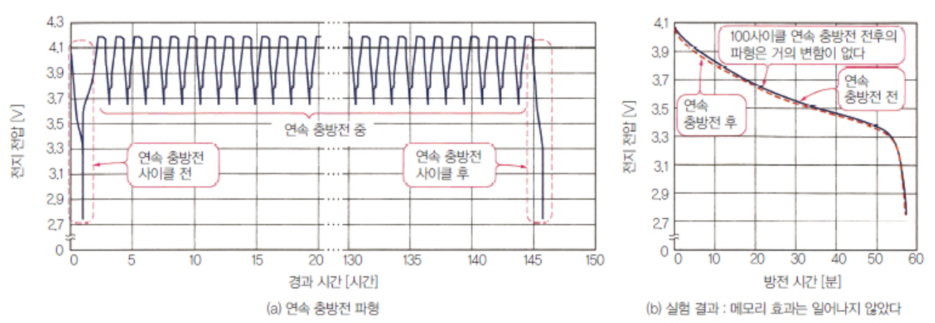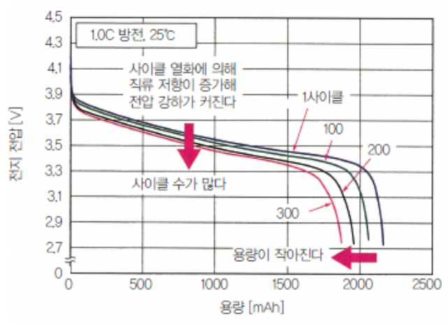 반복 사용시 전압도 낮아지고 용량도 줄어들어 수명이 감소한다