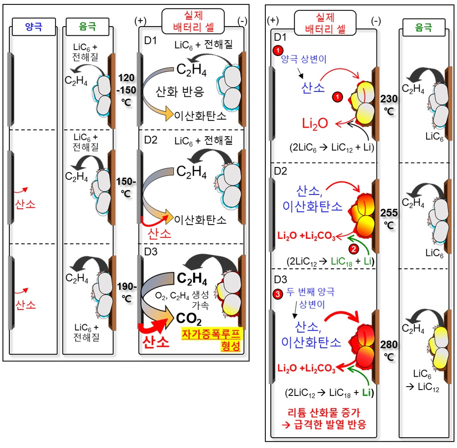 다음은 양극에 니켈이 있는 경우의 열폭주 메커니즘이다. 인산철 배터리와 유사하게 음극 쪽에서 리튬이 석출되고, 양극이 온도에 따라 상변이를 2차례 일으키면서 발생한 산소와 이산화탄소가 음극의 리튬과 만나 열폭주를 일으킨다.