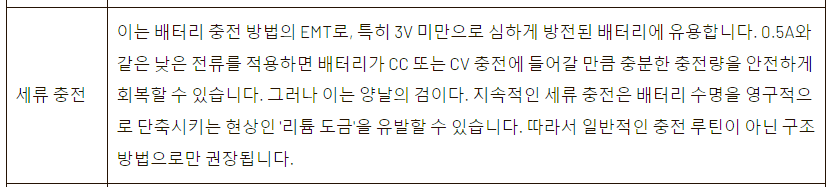좀 더 검색해 보니 과방전시 아예 충전이 안되는 경우에 대한 자료도 찾을 수 있었다. 일반적인 정전류(CC)나 정전압(CV) 충전 말고 낮은 전류로 충전하는 세류 충전이란 걸 쓰면 된다고 한다. 다만 이렇게 하면 리튬 도금(아마 음극에 리튬 금속 생기는 현상을 의미하는듯)이 일어나서 자주 쓰지 말라고 한다.