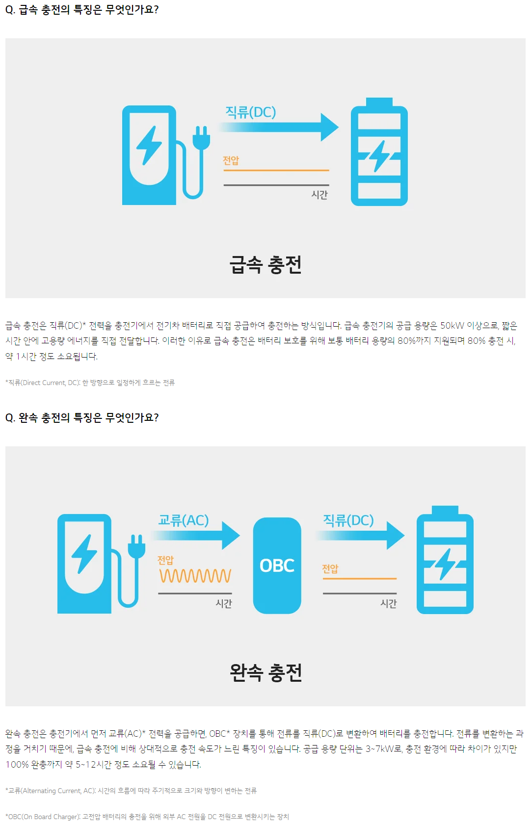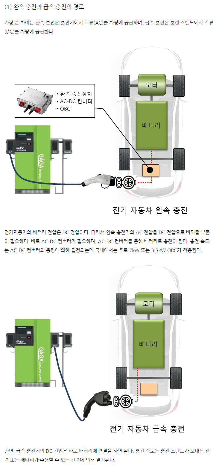 급속 충전은 직류로 직접 충전, 완속 충전은 교류로 전원을 공급하고 내부회로에서 직류로 바꿔서 충전