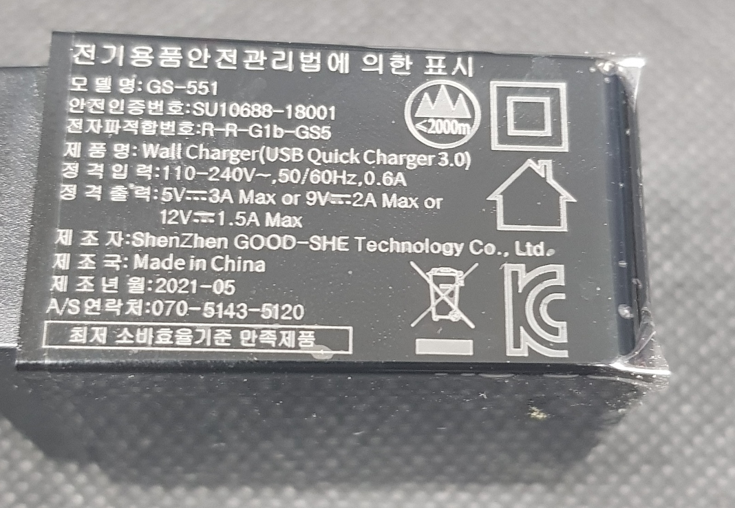 요즘은 파워딜리버리(PD)네 뭐네 하면서 같은 전압에서도 전류량이 높아서 충전이 빨리 되는 충전기들이 많이 나온다. 다음은 필자가 보유 중인 충전기의 옆면에 써 있는 내용이다. 정격입력은 어디 콘센트에 꽂아야 하는지를 나타내고, 충전능력에 관한 내용은 정격출력 부분을 읽으면 된다. 주변에서 볼 수 있는 고속충전 지원하는 대부분의 충전기는 5V, 9V, 12V를 모두 지원할 것이다. 셋 모두 표준 전압이고, 이 중 5V는 USB 데이터 통신시 표준 전압이다. 세 개 모두 앞에서 말한 충전 2단계의 전압보다 모두 높은데, 이 전압이 그대로 들어가는 것은 아닐 것으로 생각한다.