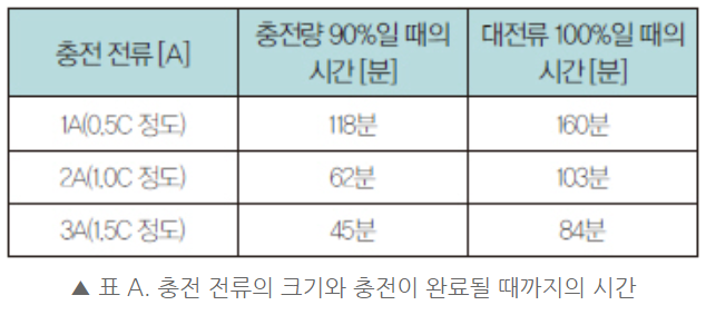 이 때의 완충 시간은 자료에 따르면 다음과 같다. 가운데 열은 90% 충전될 때까지의 시간, 오른쪽 열은 완충될 때까지의 시간이다. 당연히 최대 전류를 3배로 늘렸으니 충전 시간도 1/3로 줄어들 것으로 생각했는데, 90% 충전까지는 맞는 말이지만 완충 시간은 그거보다는 비율이 덜 줄어든 것을 확인할 수 있다.