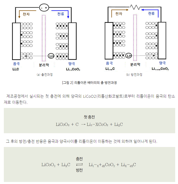 충전은 양극(cathode)의 리튬 이온이 분리막 뚫고 탄소 음극(anode) 쪽으로 이동하여 화학적으로 결합하는 현상