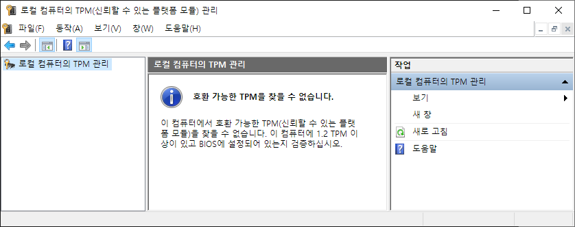 재부팅 후 실행(단축키 Win+R) - tpm.msc 실행하면 TPM 꺼졌는지 여부를 확인할 수 있다.