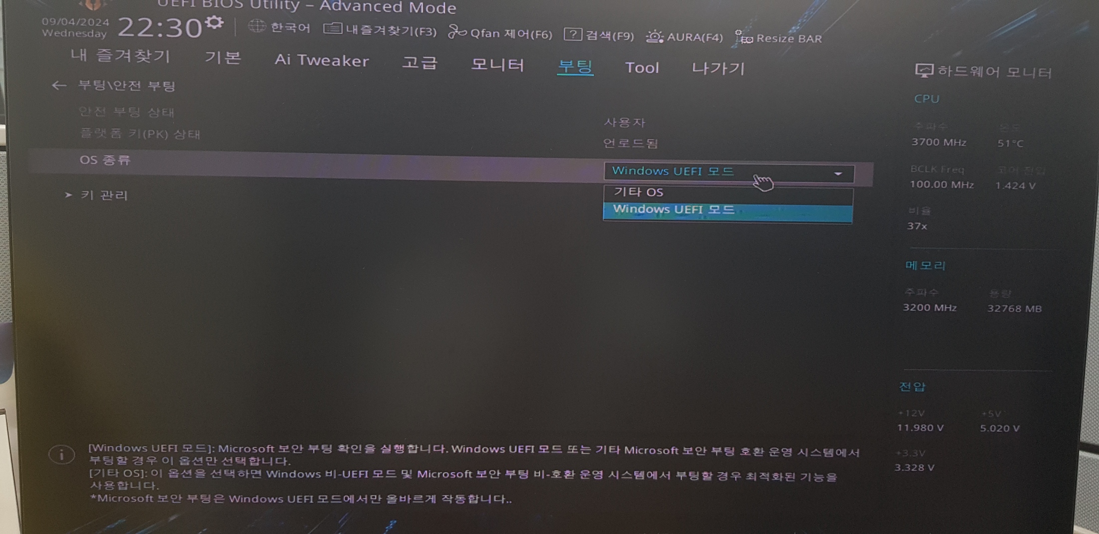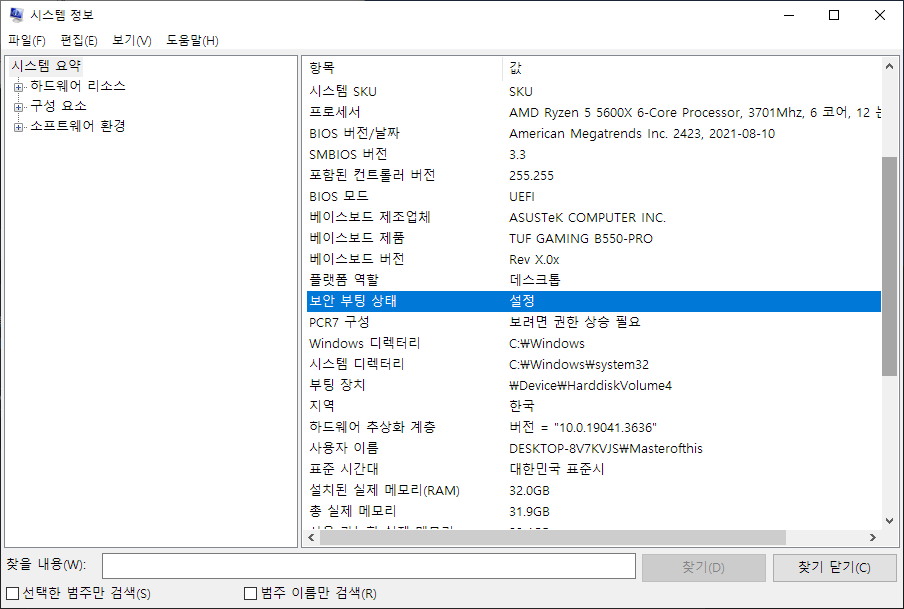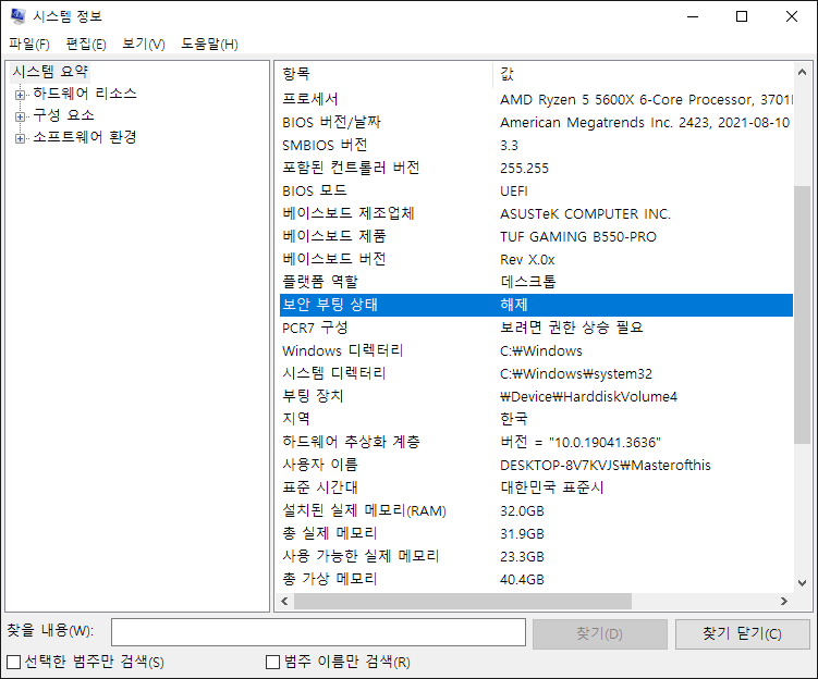스크롤 내리다 중간쯤 보면 보안 부팅 상태라고 된 게 있다.