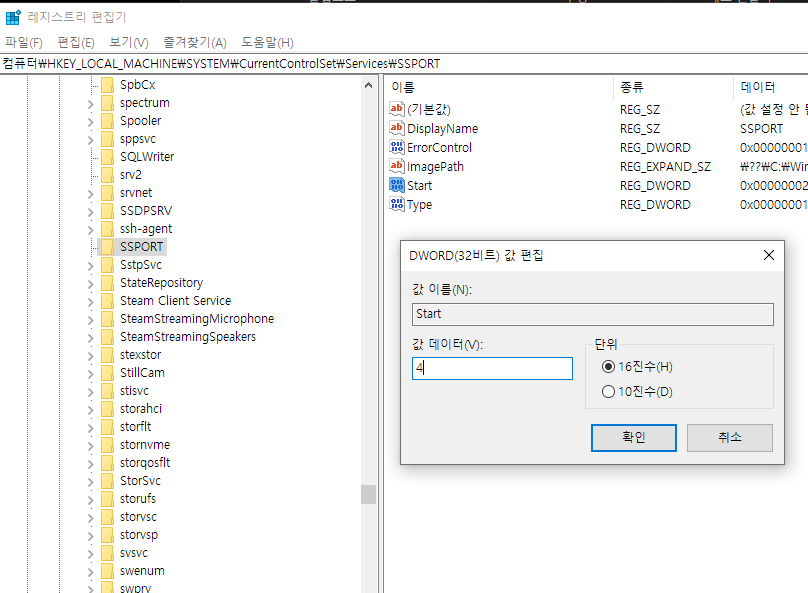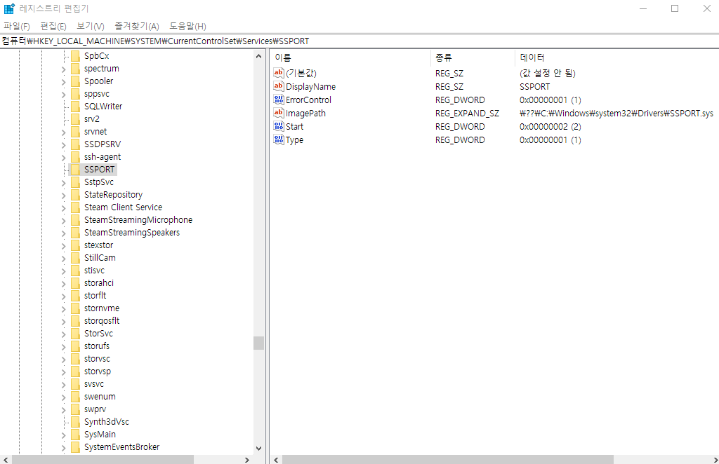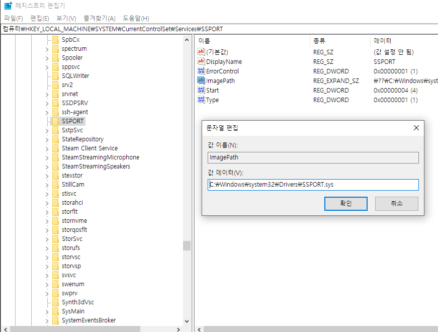 오류내용2: 다음 오류로 인해 SSPORT 서비스를 시작하지 못했습니다. 지정된 파일을 찾을 수 없습니다.